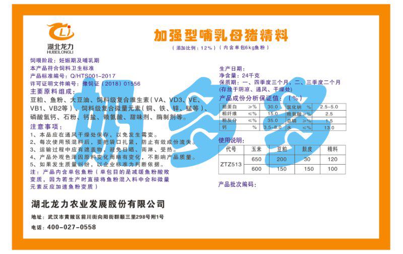湖北龍力農業發展股份有限公司坐落于武漢市黃陂區前川街向陽街群順三里298號附1號。公司成立于2014年6月,公司自成立以來把“創全球最大養豬綜合服務”為企業愿景。致力于打造教保料品牌”作為公司發展的明確目標。公司一直致力于豬營養的研究和開發,積極與國內外高校和科研機構合作,推廣養豬技術、動物營養新概念,向世界農牧企業學習與合作。公司采用國內先進的生產工藝,選擇高精度電子配料秤,高均勻度、無殘留混合機等先進設備....